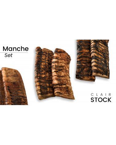 Nous prenons soin d'appareiller chaque manche : afin de vous proposer deux plaques esthétiquement proche. La corne de bélier étant très tourmenté il ne nous ai pas possible de vous garantir que les deux plaquettes proviennent de la même corne .