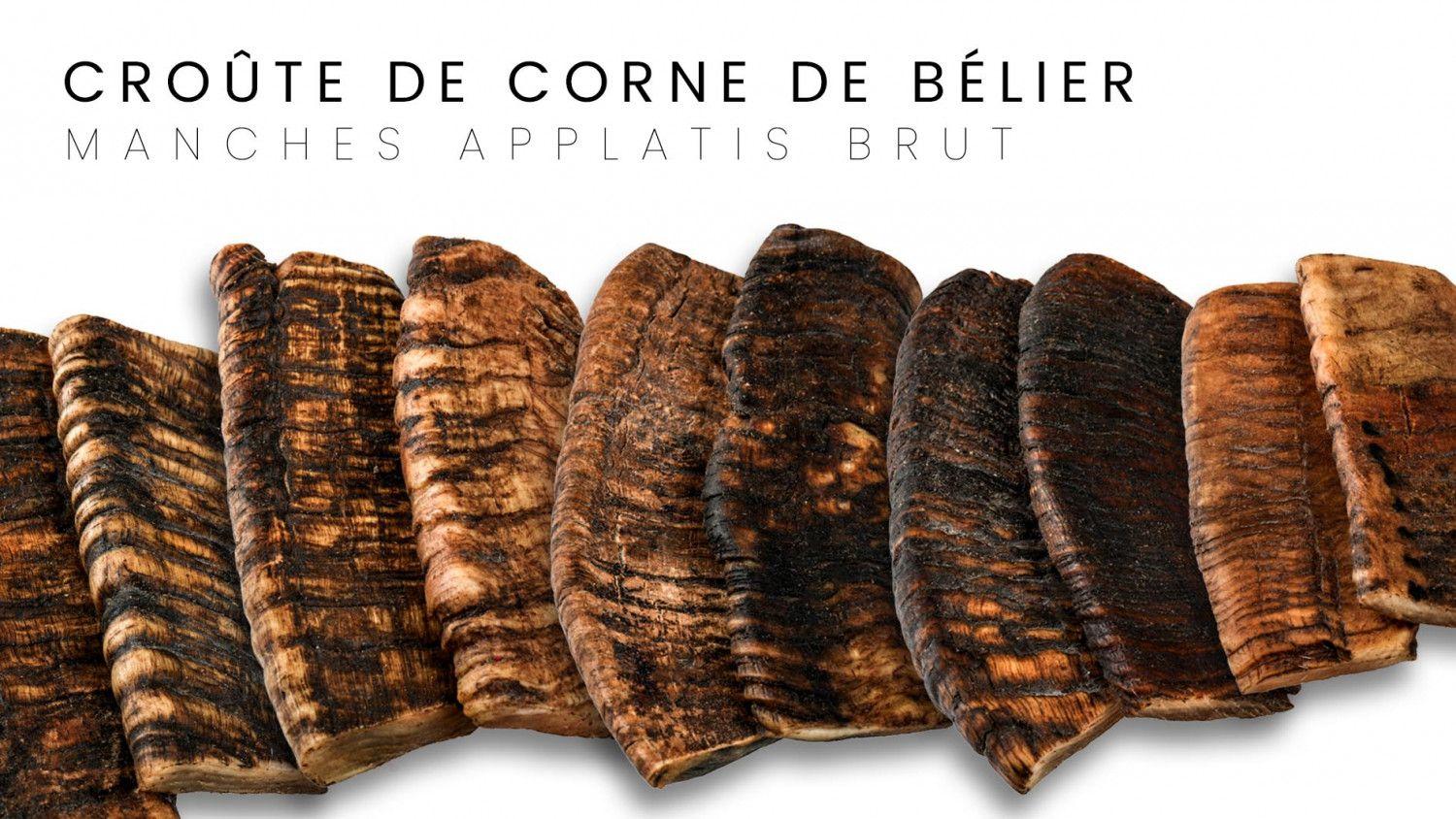 La corne est majoritairement composée de kératine. Ce qui implique qu'elle peut être aplatie ou moulée à chaud . Cette méthode permet de vous proposer des plaques de corne plates . Le "pressage de la corne " est un métier bien connu des couteliers : "cacheur" de corne .