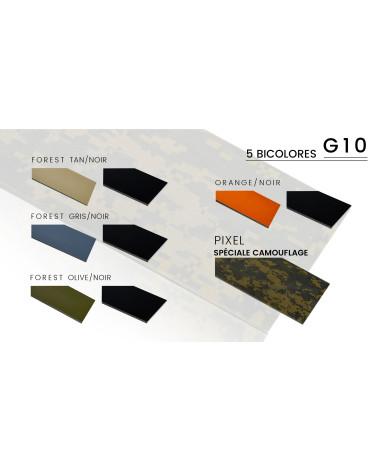 Le G10 fibre de verre est fabriqué en combinant de la résine époxy avec des fibres de verre, créant ainsi un matériau résistant aux chocs, à l'usure et à la corrosion. En raison de sa grande résistance, le G10 est souvent utilisé dans la fabrication de couteaux pour les activités en plein air, comme la chasse et la pêche, ainsi que pour les couteaux de poche et les couteaux tactiques.