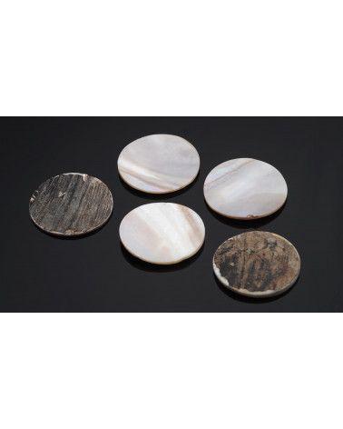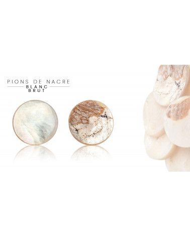 De nombreux coquillages produisent naturellement de la nacre, une couche irisée dans la partie interne de la coquille. C’est une matière difficile à travailler mais qui a un rendu final magnifique. Les pions ou pastilles de nacre peuvent être percés pour devenir des boutons de chemise par exemple.