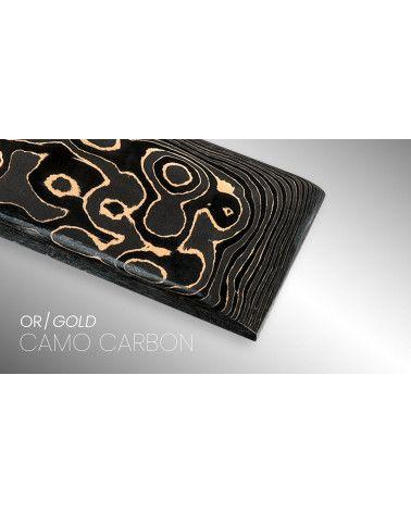 The Camo Carbon is a composite containing bronze or metallic copper (optional) between each layer of carbon fibre. These metals have several advantages. It increases the thermal conductivity of the composite, making the manufactured components pleasant to the touch, a considerable advantage for the design of a watch case or knife handle on a modern outdoor knife. Other characteristics such as temperature resistance (TG 120c), high impact resistance, minimum risk of delamination, good machining properties. These benefits are appreciated by modern manufacturers who use manual or CNC machines, strip sanders or hand tools.