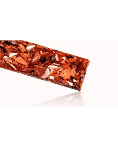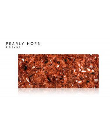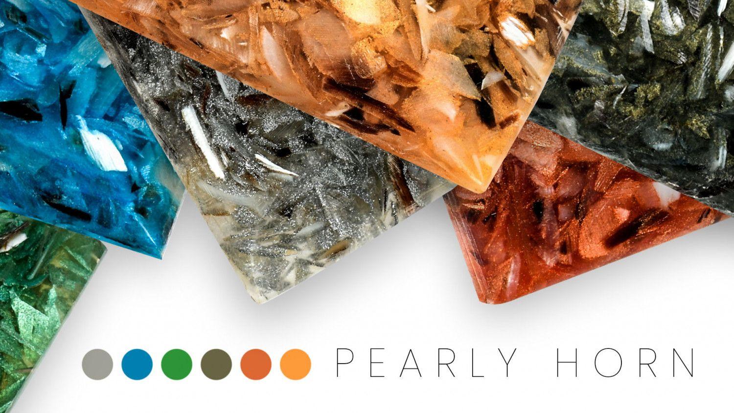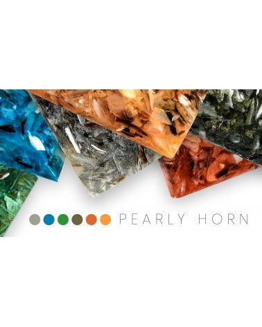 Horn, without the constraints of the animal product with organic resin. With a reduced horn in glitter in a special grinder, we add resin loaded with pearl dyes. The resin used is a BIO epoxy resin.